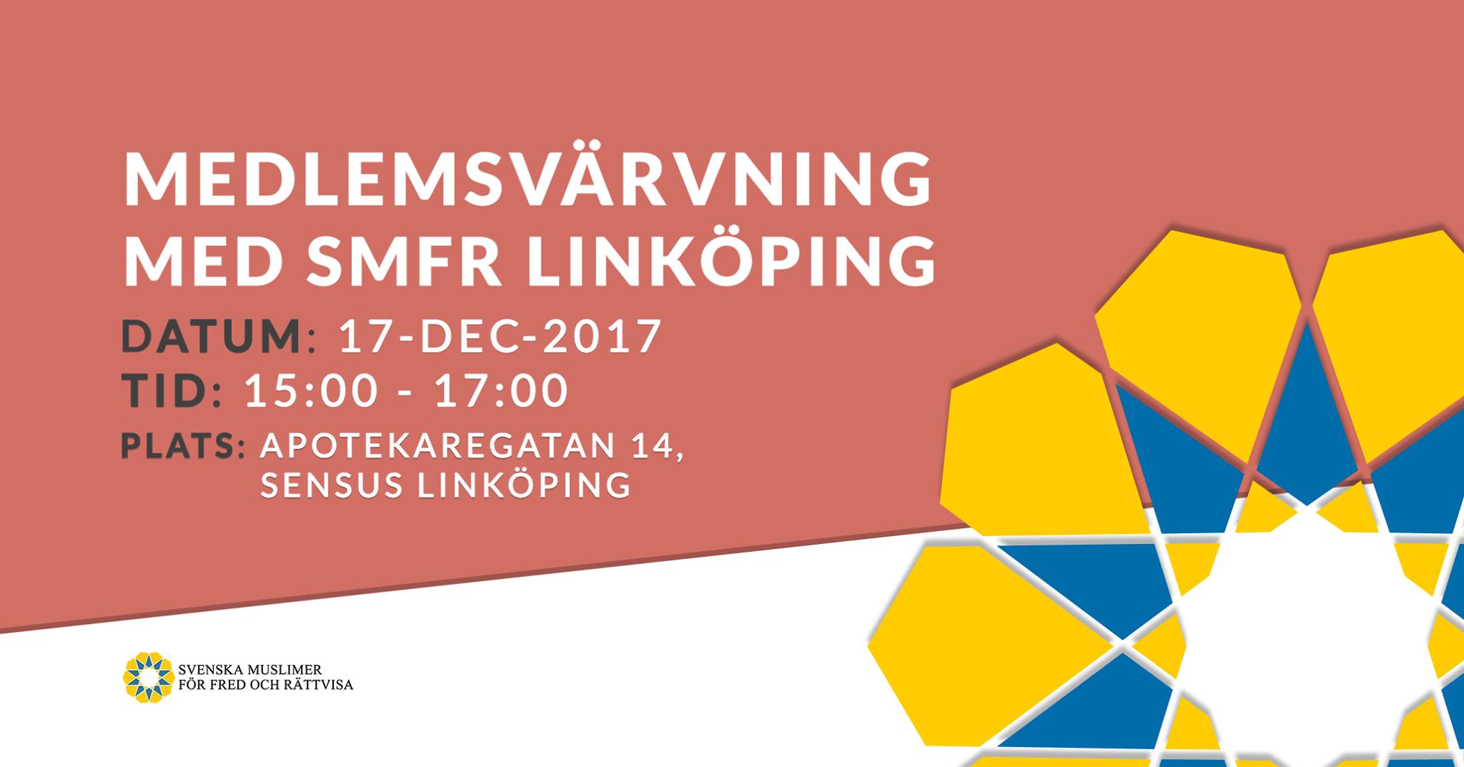 SMFR Linköping träffas för att värva fler medlemmar. Ju fler medlemmar desto större möjligheter att vi i framtiden ska kunna fortsätta erbjuda aktiviteter och föreläsningar. Efter aktiviteten kommer vi ha lektion som vanligt i arabiska och Koran så kom och joina oss för en eftermiddag och kväll fylld av nytta och gott umgänge!