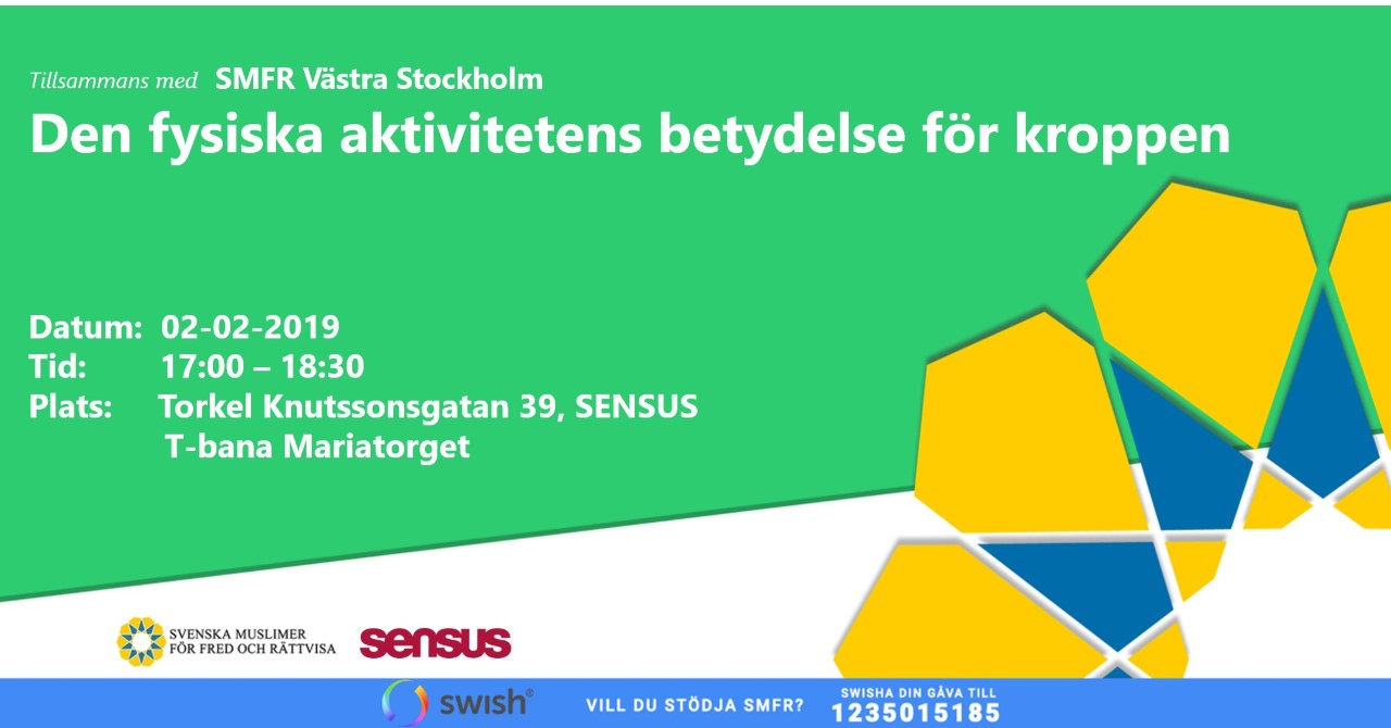 SMFR Västra Stockholm bjuder in till en första av förhoppningsvis flera föreläsningar på temat “Idrott och hälsa”. Alla vet att fysisk aktivitet är bra för kroppen, men vad händer när vi rör på oss och är fysisk aktiva? Forskning visar entydigt att när vi rör på oss på ett mer strukturerat sätt i syfte att öka eller bibehålla konditionen så blir vi piggare och mår bättre. Träning påverkar även minnet, koncentrationen, sömnen och stresståligheten på ett positivt sätt. Träningen är rättvis då den har positiv effekt på alla, oavsett kön, ålder, etnicitet, religiös eller politisk uppfattning.