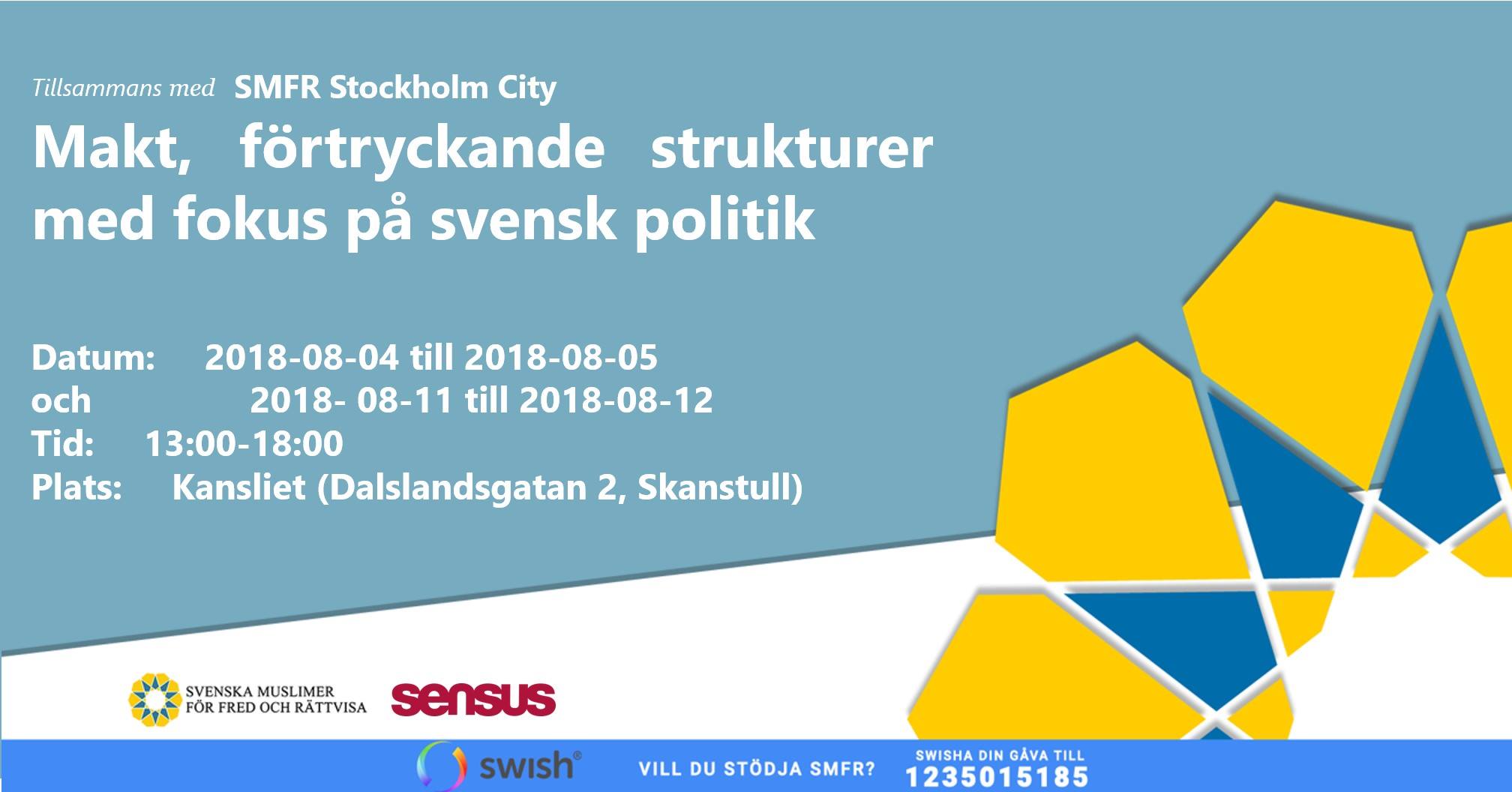 Under helgerna 4-5 augusti och 11-12 augusti anordnar SMFR Stockholm City en utbildning i svensk politik. Amal Seraj kommer att hålla i utbildningen och vi kommer prata om strukturell rasism, sexism och klassförtryck. Vi kommer även att gå igenom ideologerna och rörelserna som påverkar svensk politik.